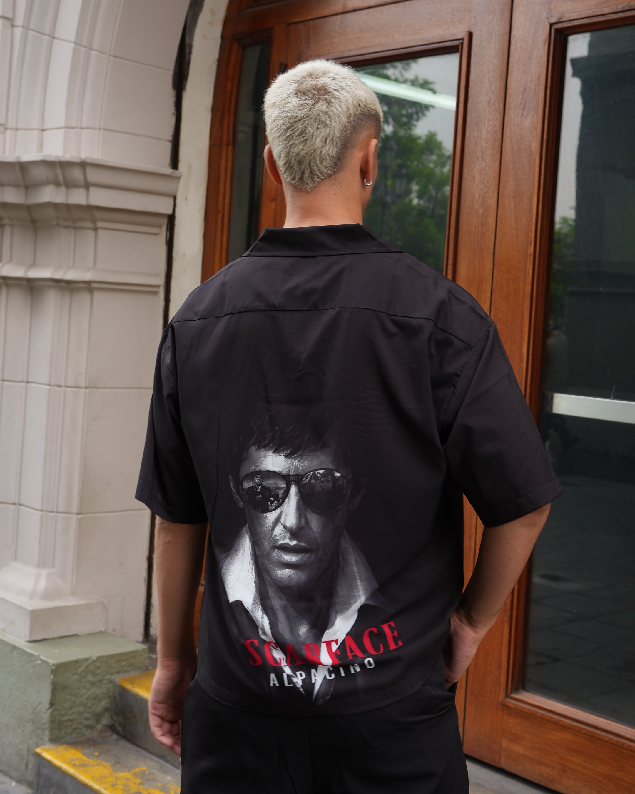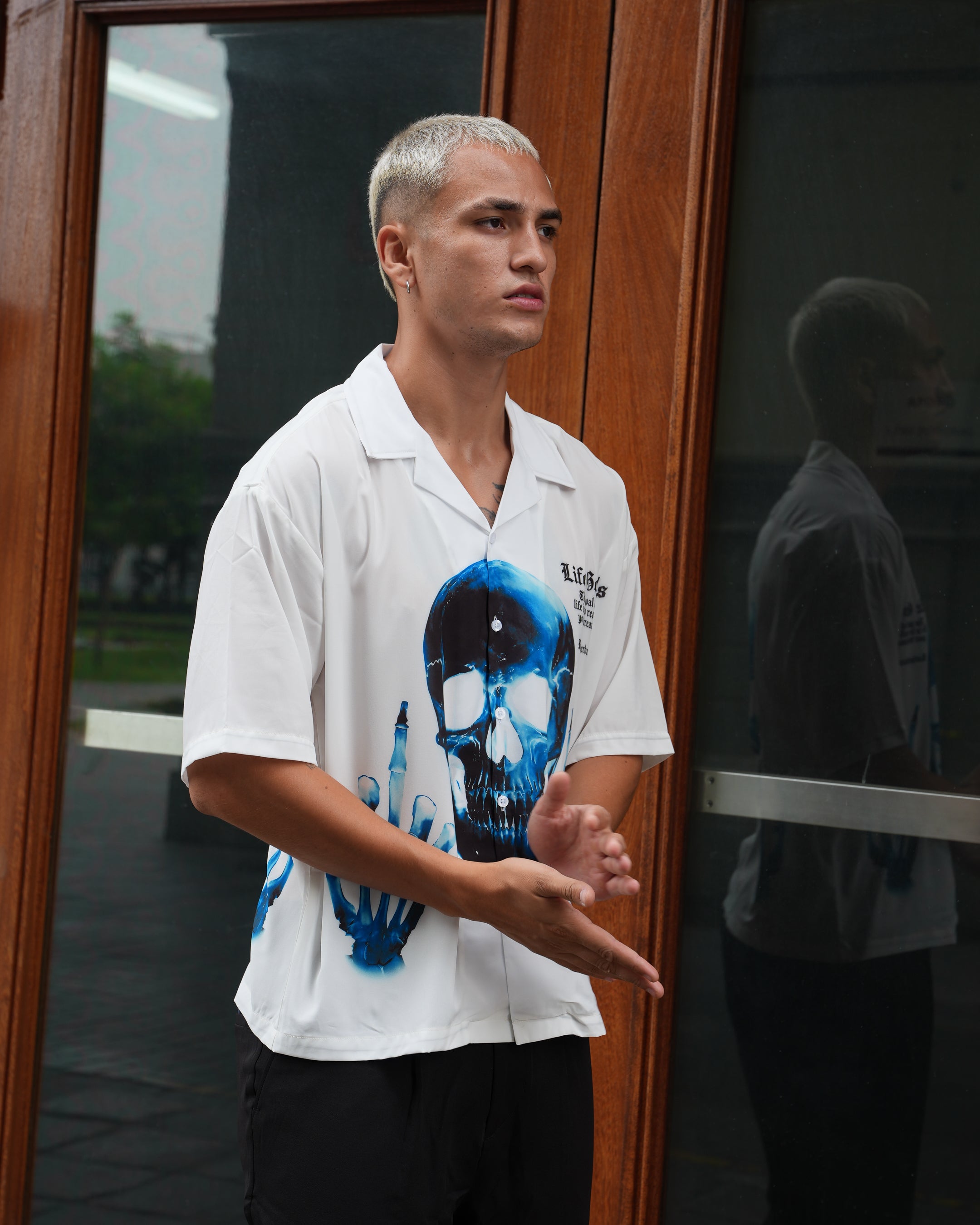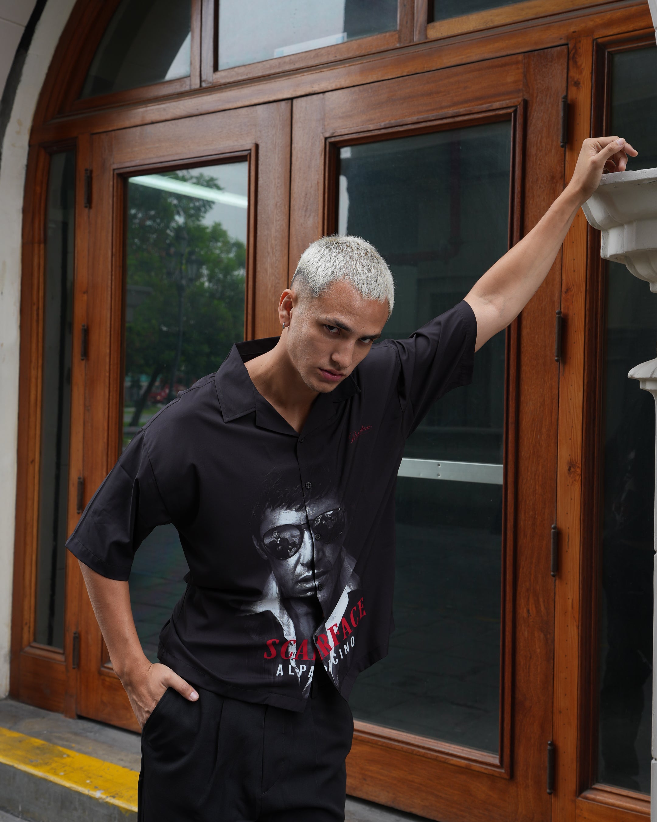 Camisa de seda, sublimada en piezas para generar una armonía con el diseño, botones personalizados de la marca.